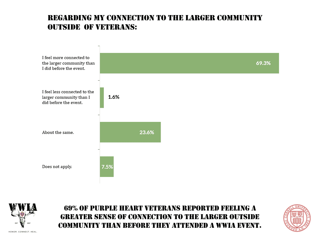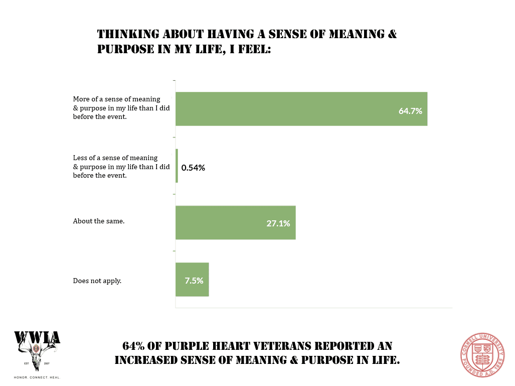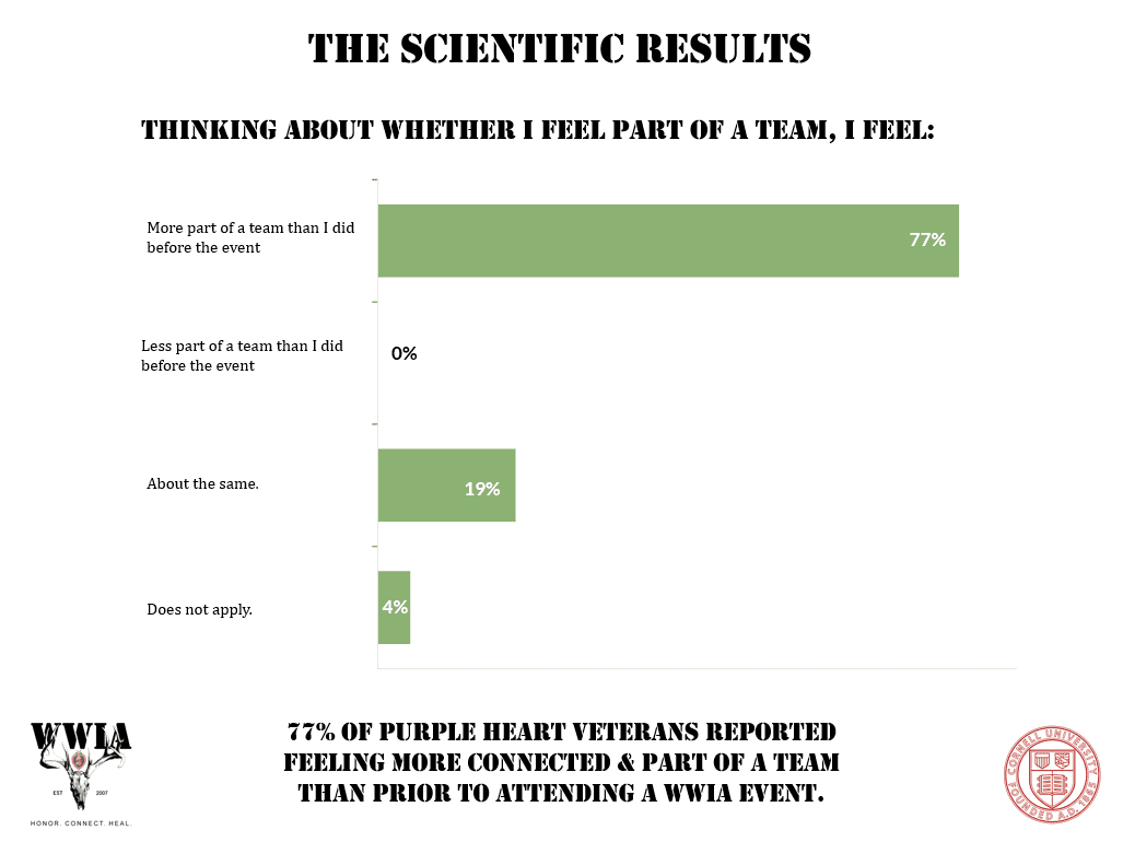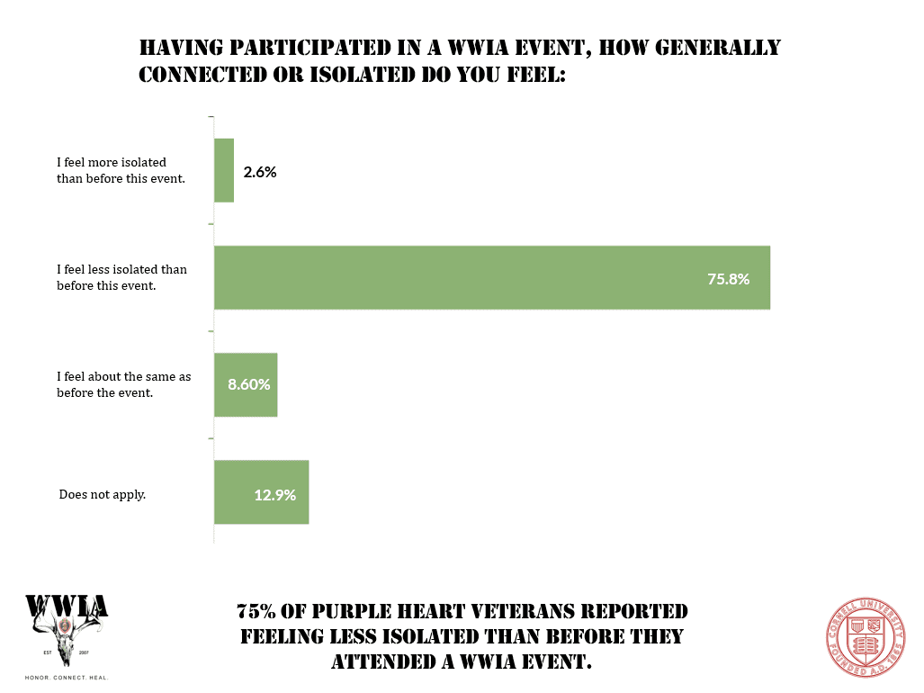 WWIA is committed to healing the lives of America’s Veterans and reducing Veteran suicide. More than 1,600 Heroes have shared testimonials describing how their WWIA experiences profoundly improved their happiness, health, healing, and overall well-being. This isn’t hype — it’s real and evidence-based. Cornell University has studied the impact of our program and how it reduces the risk factors of suicide, and the results are remarkable. Our mission is changing lives.