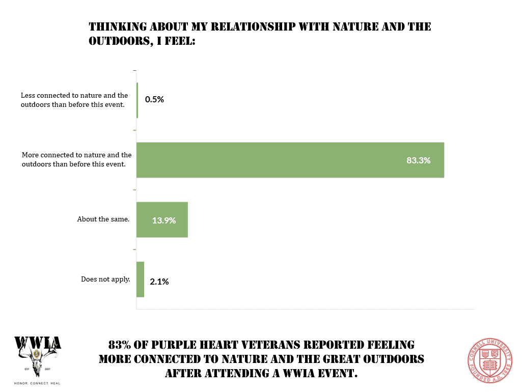 In 2022, WWIA partnered with Cornell University on a joint, multi-year study led by Dr. Keith Tidball (Assistant Director, Cornell Cooperative Extension; Senior Extension Associate, Natural Resources and the Environment; and WWIA Science Advisor). The research centered on ten protective factors known to influence suicide risk among Veterans—factors such as Post-Traumatic Stress symptoms, low self-esteem, isolation, and loss of interest.