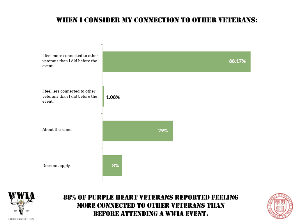 More than 500 Purple Heart recipients participated, sharing their experiences with each of these ten risk factors both before and after attending a WWIA event. The outcomes speak for themselves. The data clearly shows that our mission—to provide Honor, Connection, and Healing to America’s combat-wounded Veterans—is not only meaningful, but effective.
